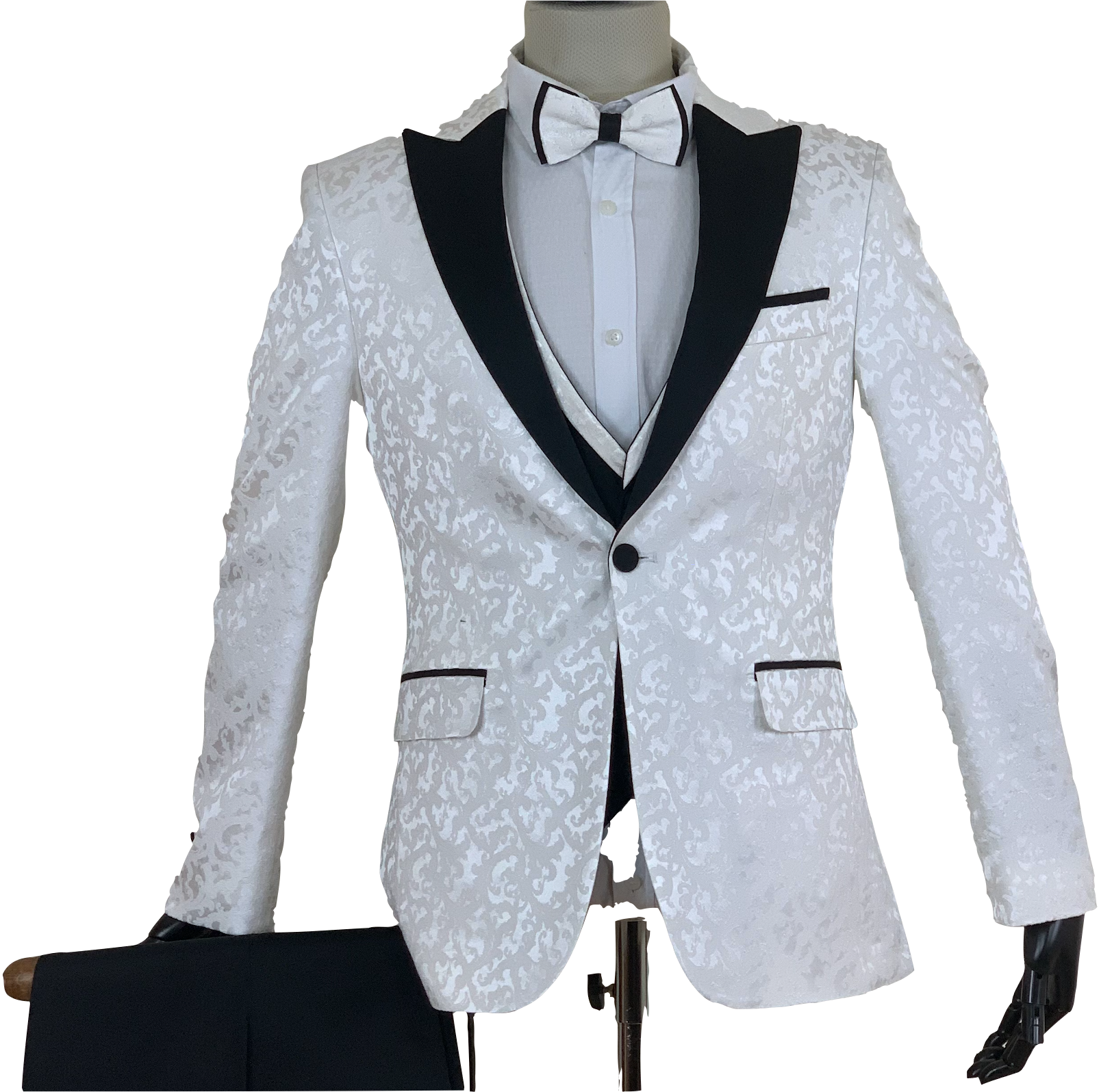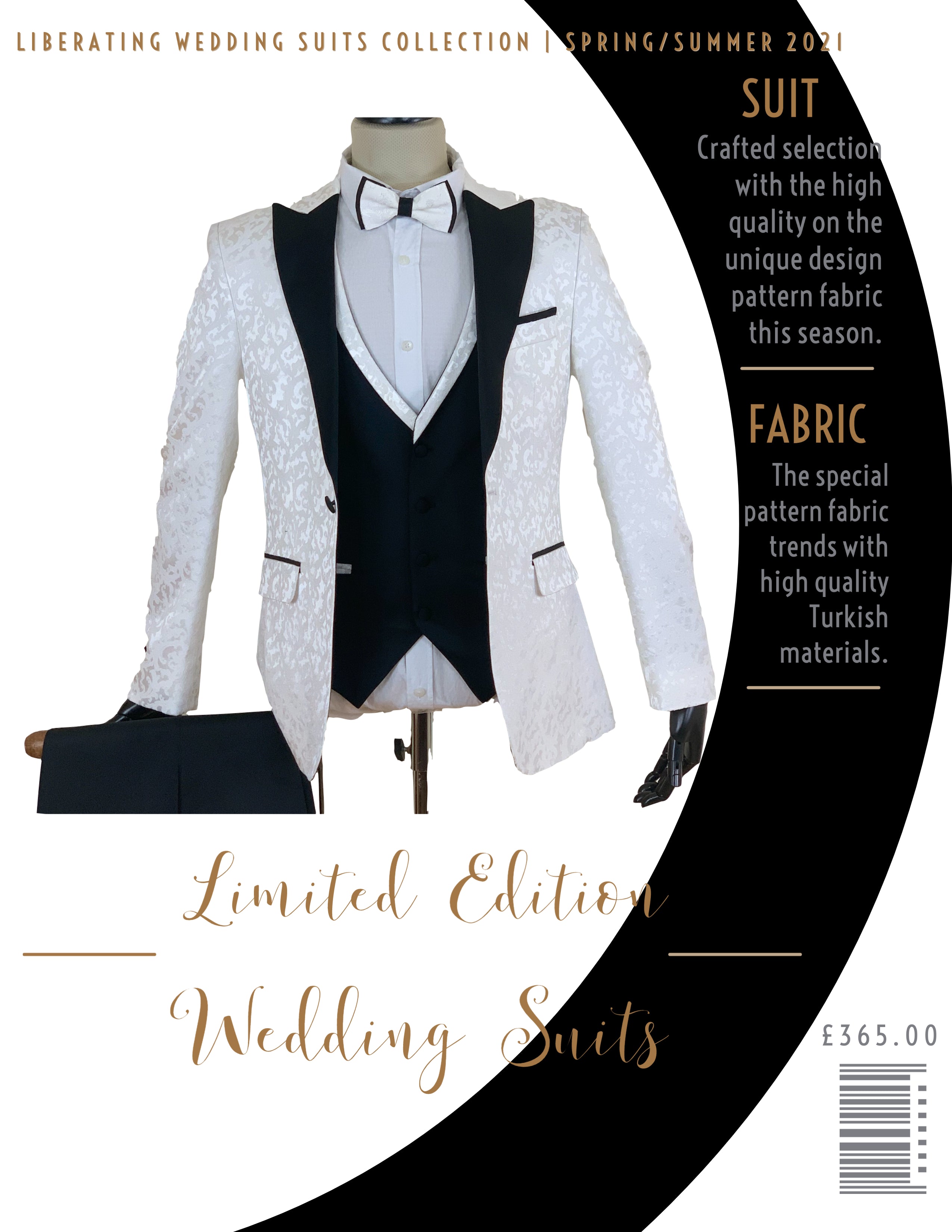 The Liberating Groom Suits Collection turn up unforgettable in this textured white 3 piece a design with black luxury details, covered buttons and...