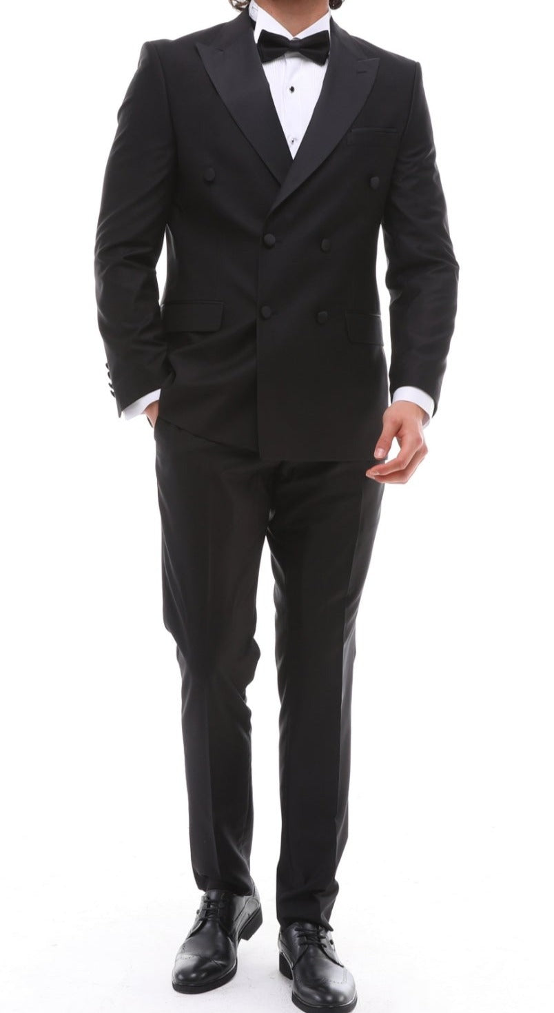 Men's ANTIQUE Black Double-Breasted Tuxedo - Black Satin Details Suit