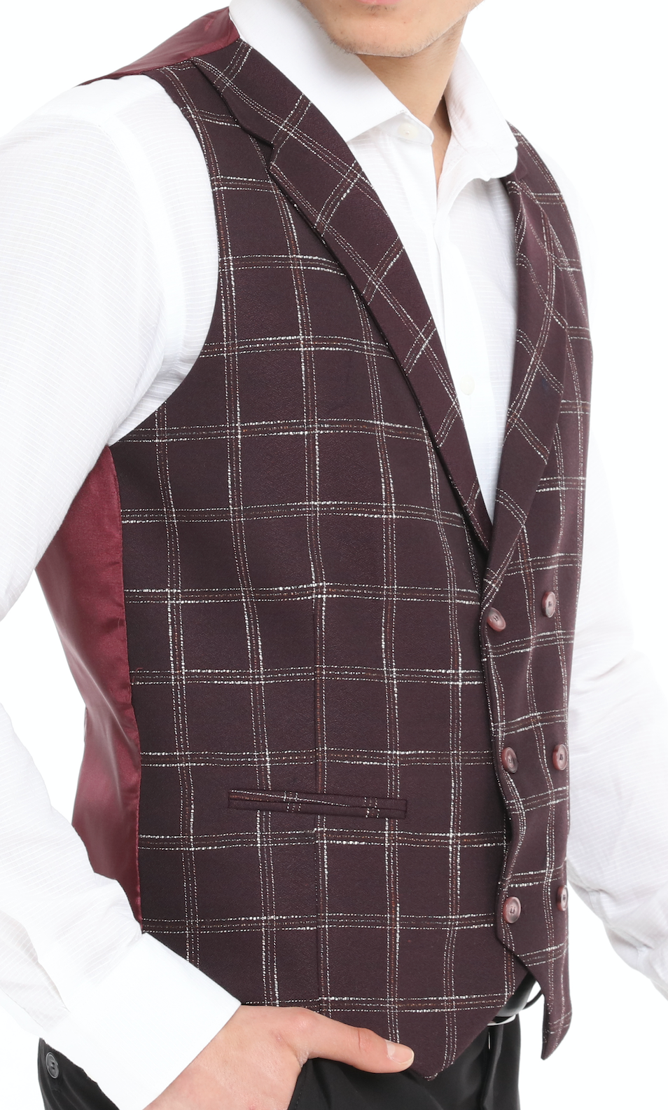 ICONIC BURGUNDY DOUBLER - Red Check Double Breasted Waistcoat