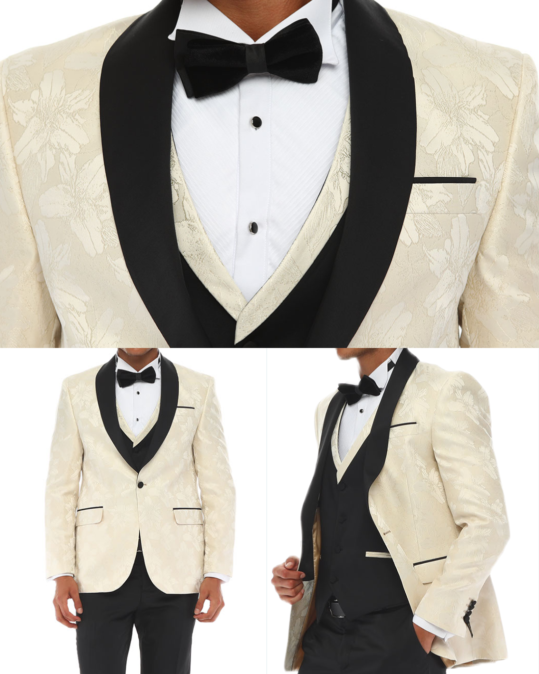 Iridescent Cream with Gold Brocade Design Deco Stitched Fabric with Satin Quality Fabric : 4 Piece Tuxedo Suit - Dinner & Wedding Cream with gold details Tuxedo 4 Piece Suits , A timeless London Design Cream Colour Design High Quality Fabric Pattern Tuxedo Suit that can be styled up for special days. The matching quality white shinny pattern waistcoat and satin black shiny trousers and matched bow-tie are paired with the whole design. You’ll love the patterned lining panels on this suit, especially the one in the jacket’s breast pocket which doubles up as a pocket square.