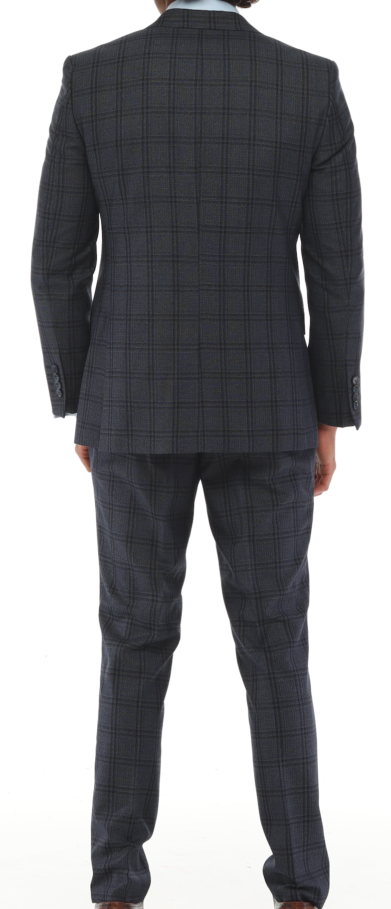 A timeless a Charcoal & Blue check three piece suits that can be styled up for special events or styled down for any occasions....