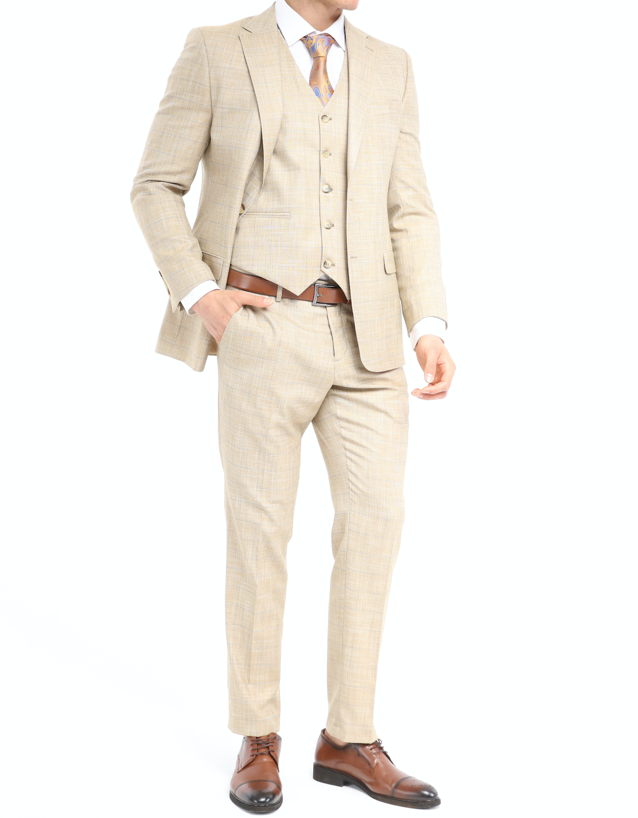 A timeless mustard with light blue check three pieces Linen suits that can be styled up for special events or styled down for the office. The matching quality a mustard with light blue check linen waistcoat and trousers are paired with a mustard with light blue check linen suit jacket. You’ll love the patterned lining panels on this suit, especially the one in the jacket’s breast pocket which doubles up as a pocket square.