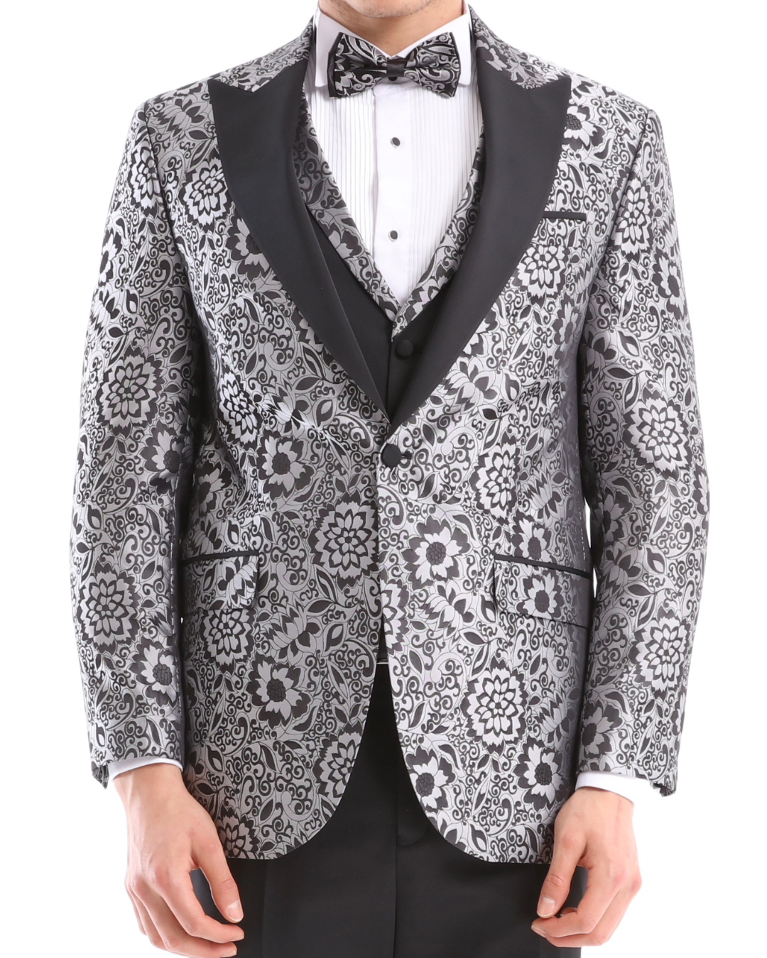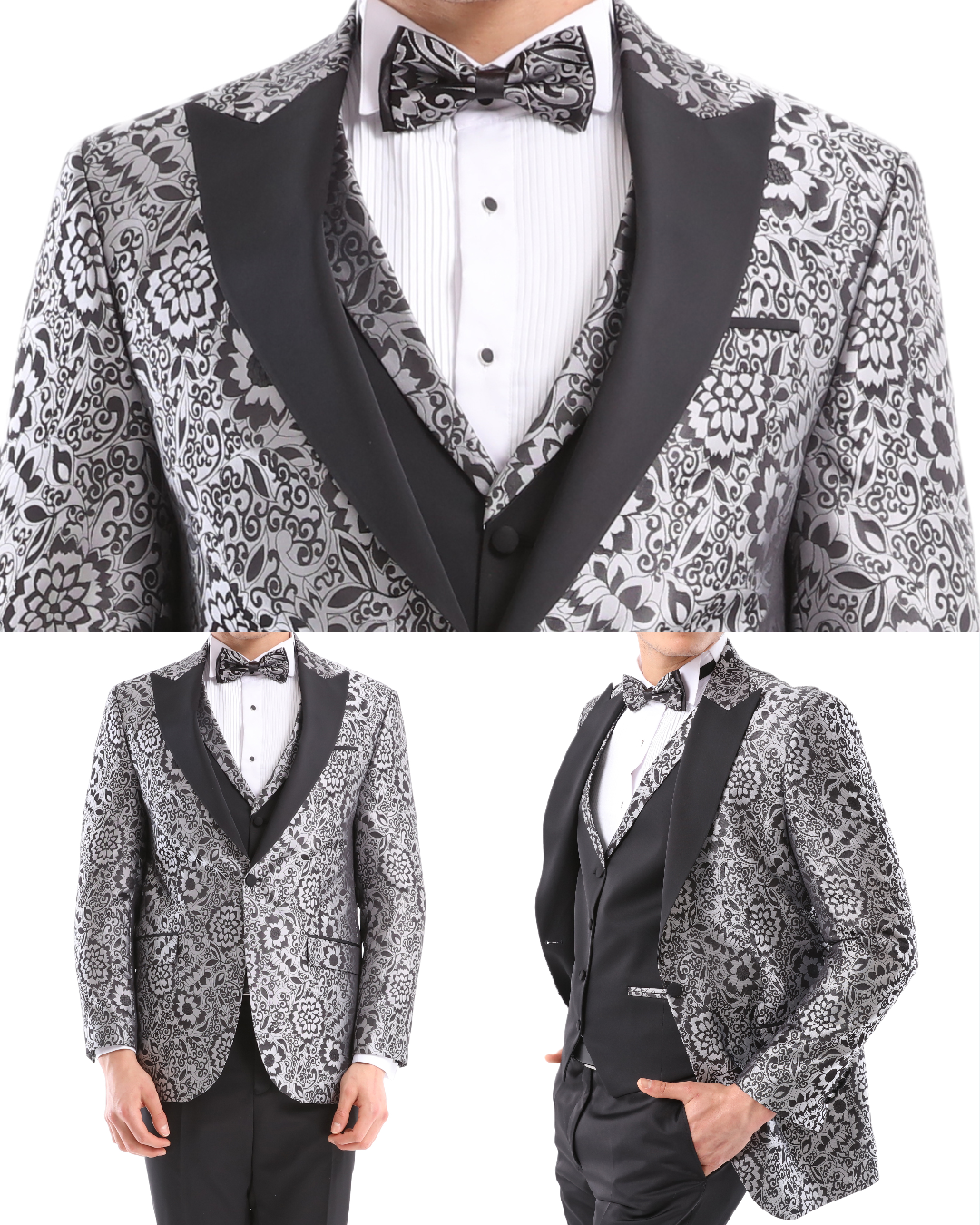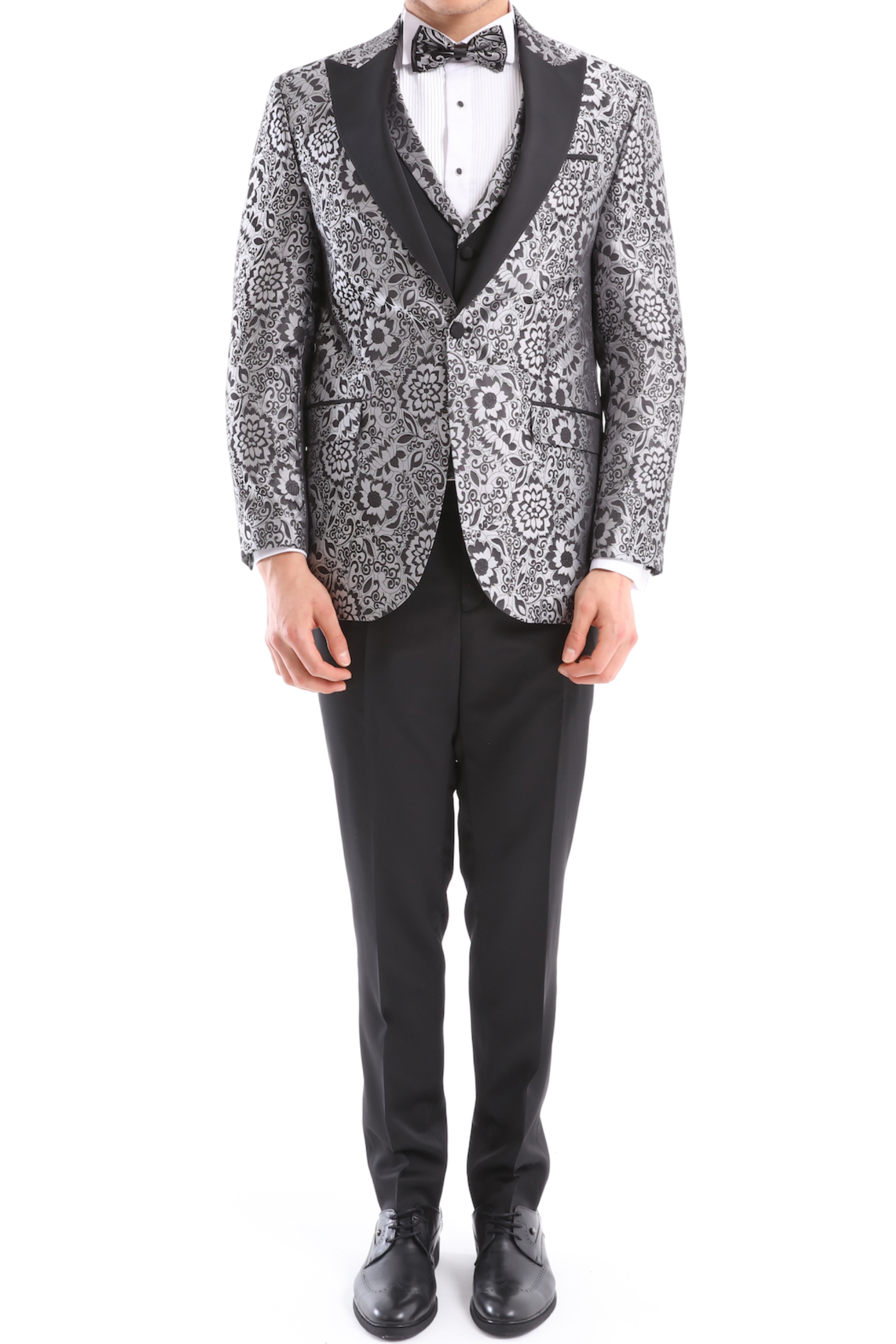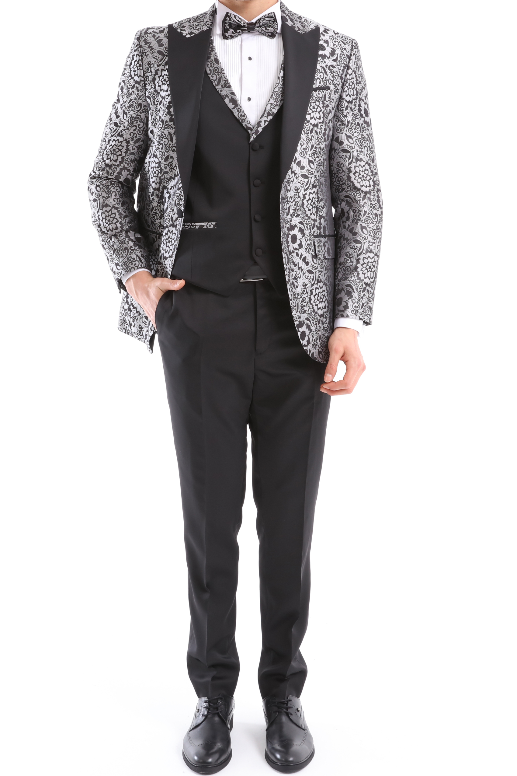 A timeless London Design Grey and Black Floral Design High Quality Fabric Pattern Tuxedo Suit that can be styled up for special days. The matching quality matched pattern waistcoat and satin black trousers and matched bow-tie are paired with the whole design. You’ll love the patterned lining panels on this suit, especially the one in the jacket’s breast pocket which doubles up as a pocket square.